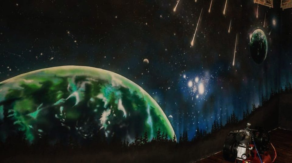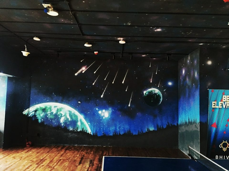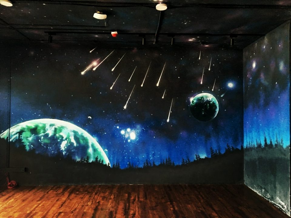 Displaying art in the workplace can elevate employee performance, mood, and physical well-being, as well as bolster interpersonal bonds between employees and clients. Here we did a galaxy mural to transform a typical workspace to something out of the world